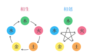 循環の順序には、木は土に、土は水に、水は火に、火は金に、金は木に勝つとして木金火水土の順番とする相剋(勝)説と、木は火を、火は土を、土は金を、金は水を、水は木を生ずるとして木火土金水の順とする相生説とがあります。